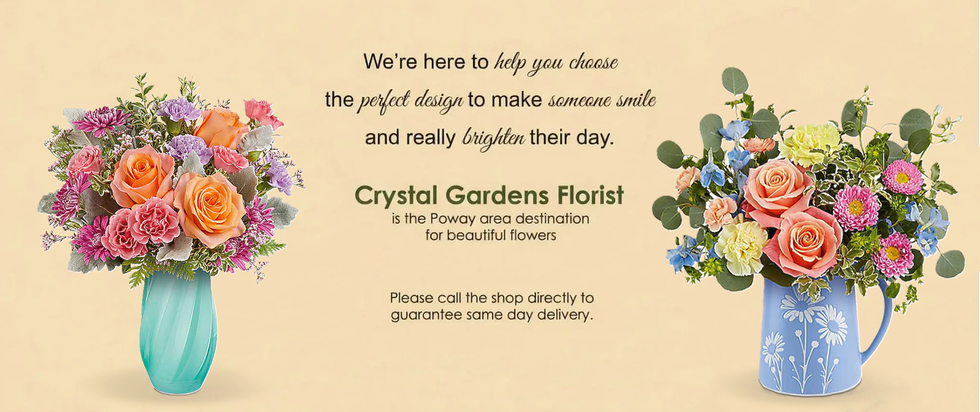 Today was the last day of my sister's Chemo treatments, and since I do not live in Poway, I went online to find a shop to send her flowers. I looked online and found some things that were beautiful, but not what I wanted. I called and spoke with the wonderful people at Crystal's, told them what I wanted and they made a beautiful arrangement that my sister loved! She said it smelled amazing, and sent me a picture that was beyond beautiful and more than I could have imagined! Thank you Crystal Gardens, for making an amazing day even better!