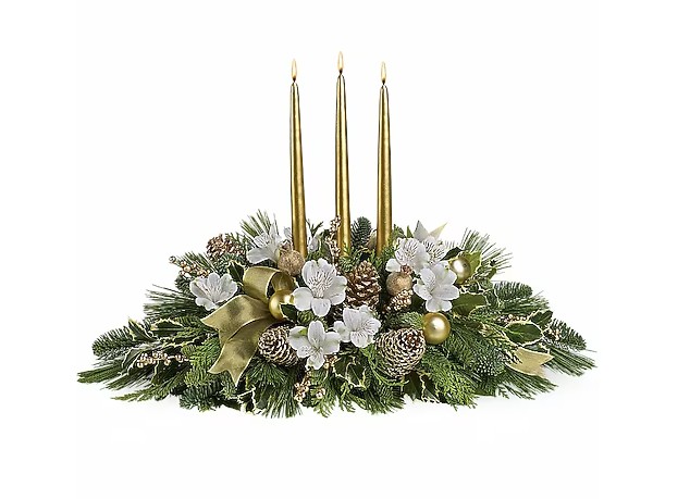 Three gorgeous gold taper candles take center stage in an arrangement of crème roses and spray roses, white alstroemeria, gold ornaments, pinecones, intricate mesh ribbon, Christmas greenery and more. This kind of high style really is fit for a king or queen!