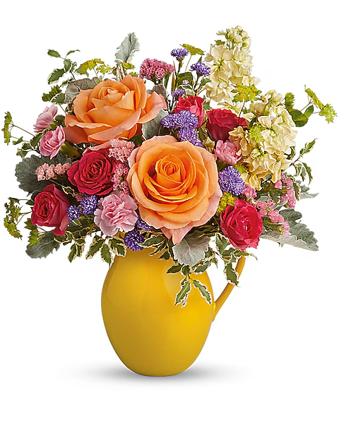Peach roses, hot pink spray roses, minature pink carnations, light yellow stock, large purple monte cassino asters and pink sinuata statice are accented with bupleurum, pitta negra and dusty miller. Delivered in a Sunny Day Pitcher.