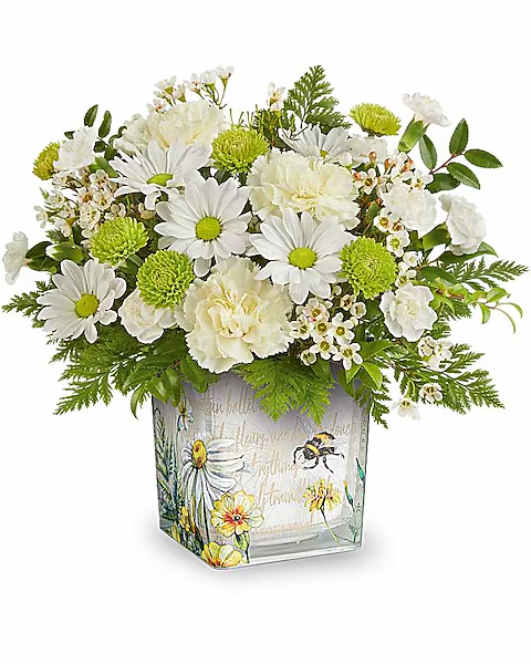 Celebrate them with this captivating white, light yellow, and green bouquet, elegantly presented in a keepsake glass cube decorated with a charming buzzing bee design.