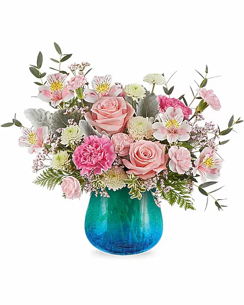 As soothing as a sea breeze, the Blue Hues Bouquet blends soft pinks and whites in a turquoise glass vase with a luminous gradient and crackled texture. This fresh and graceful arrangement brings effortless beauty to any space.