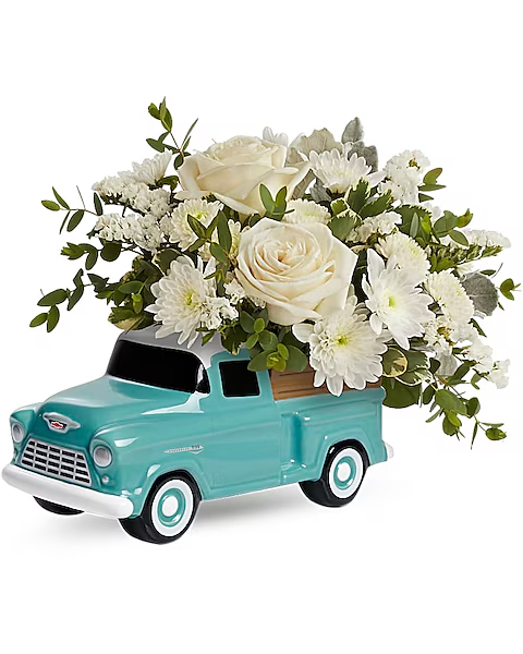 White roses, white cushion spray roses, white button spray chrysanthemums, white sinuata statice and parvifolia eucalyptus are accented with dusty miller and variegated pittosporum. Delivered in a Chevy Pickup Keepsake.