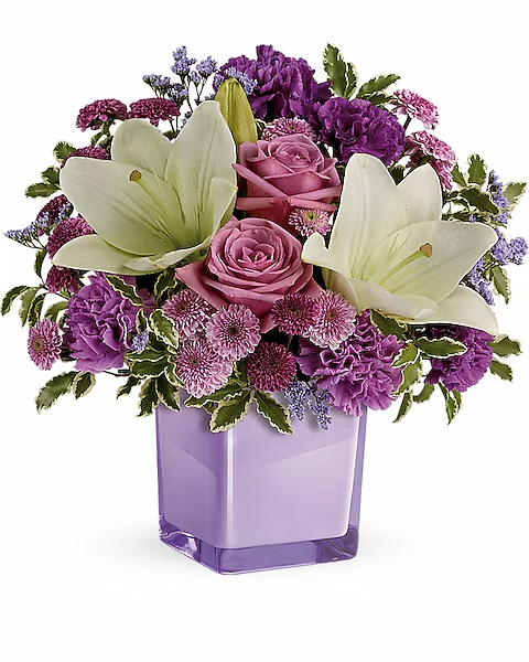 These luxurious lavender roses and crisp white lilies are poised to please! Perfectly presented in a stylish cube vase, it’s an any-occasion surprise they’ll never forget!