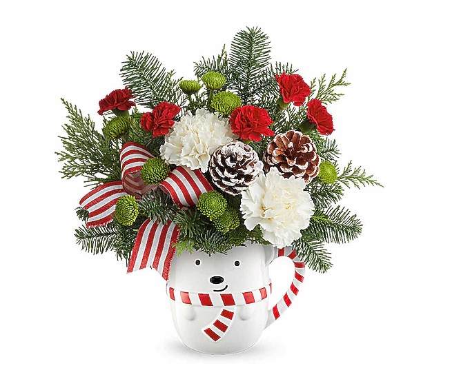 Send a bear hug full of holiday cheer! Bear Hugs & Wishes Bouquet features festive blooms and winter greens in a sweet bear mug-perfect for cozy Christmas gifting or decorating.