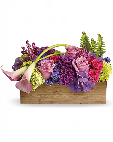 Lovely lavender hydrangea and roses, pink miniature callas, hot pink spray roses, purple carnations, heather, fern and more fill a natural bamboo container.